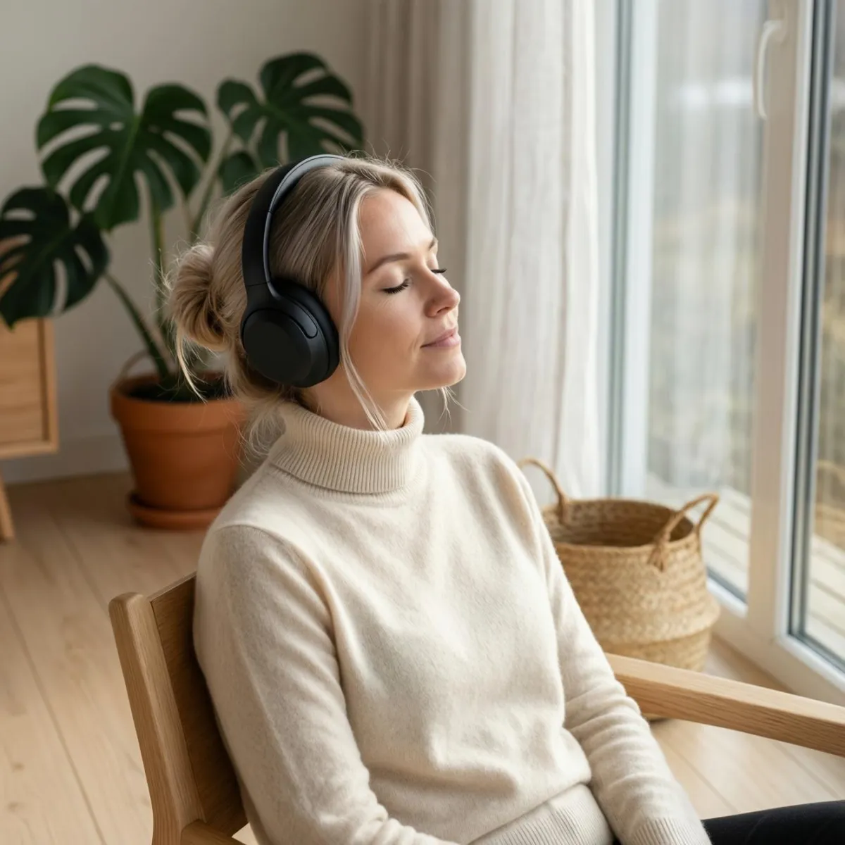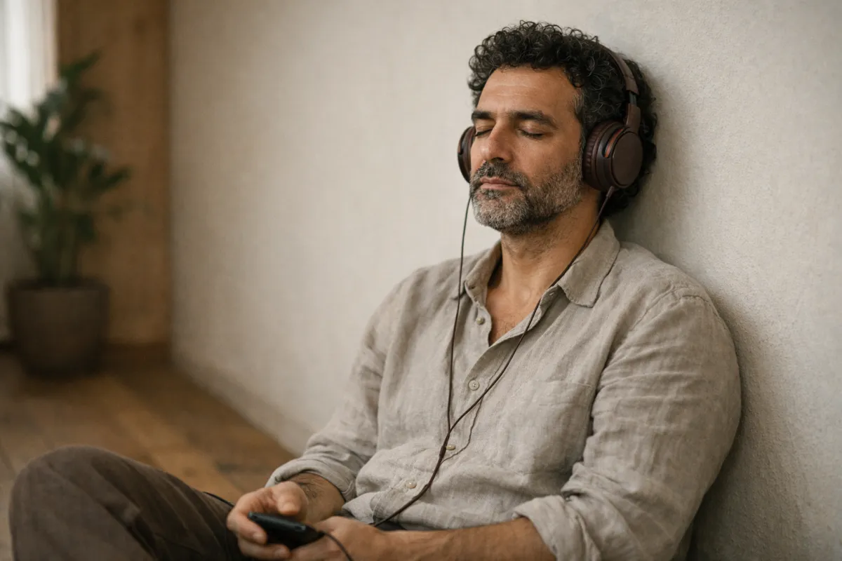 Setze Kopfhörer auf.